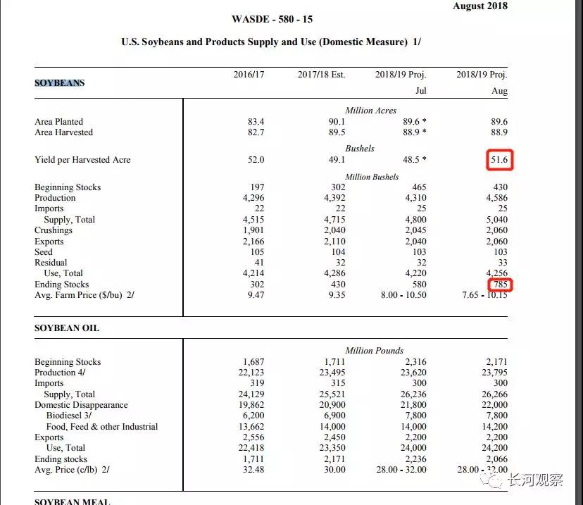 新作方面,脱离趋势单产后,单产大幅超市场预期,上调至51.6(7月48.5)种植面积维持不变在89.6,最终产量上调至45.86亿蒲(7月43.10亿蒲)且新作同样小幅上调压榨至20.60亿蒲(7月20.45亿蒲)小幅上调新作出口至20.60亿蒲(7月20.40亿蒲),至最终新作库存上调至7.85亿蒲(6月5.80亿蒲)。总体来看,此次报告印证市场预期,上调单产数据至期末库存继续大幅上调,利空盘面。