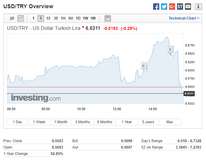 自通胀和央行消息过后,美元兑土耳其里拉短线下挫,目前由涨转跌,现报6.5311,较通胀数据前里拉涨超2%。