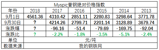 表一:近五年Myspic普钢绝对价格指数对比