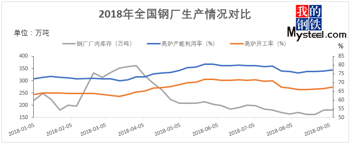 图二:2018年全国钢厂生产及厂内库存量对比