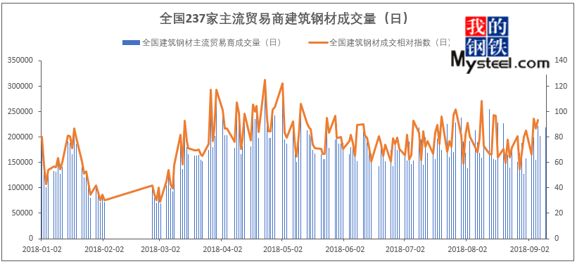 由上图看出,进入九月份后,全国主流贸易商建筑钢材成交量有明显增加,但增幅低于预期。据统计,7月份全国主流贸易商建筑钢材成交量约184299吨,而8月份全国主流贸易商建筑钢材成交量175803.69吨。而进入九月份以来,日成交量数值达到200000吨左右,较7-8月份有小幅增加,但增幅低于预期。主要是一方面,经历过七八月份的高温天气影响,九月份为下半年项目集中开工期,而且下半年资金面偏紧的局面有明显改观,需求面有一定好转;但另一方面,作为传统需求淡季, 7-8月份建材价格却逐步走高,因此全国建材成交量仍呈现稳步增长局面,难以排除提前透支“金九银十”旺季需求的可能。
