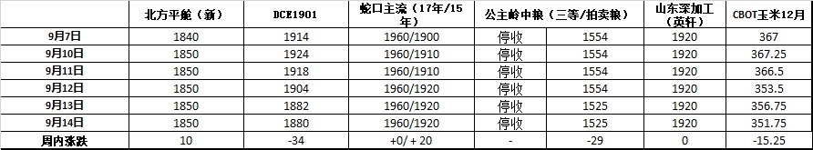 2018年9月9日~9月15日(第37周)我国北方新季玉米上市季正式拉开大幕,一方面,今年关内、关外部分地区玉米收获时间较往年提前7天甚至10天以上;另一方面,关内外深加工企业和东北港口开始收购新季玉米。同时,9月10日九部门发布《关于切实做好2018年秋粮收购工作的通知》。不过,由于今年东北玉米开秤价格同比高开100元/吨以上,且目前上市数量有限,现货市场(除华北新粮上市区域)价格续涨。