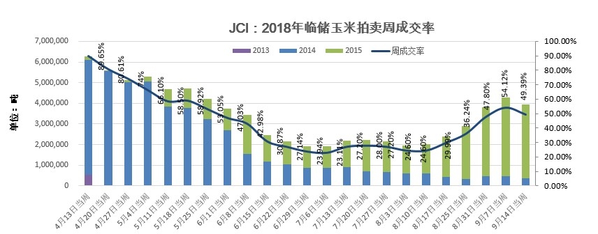 截至9月14日当周(第23周)临储玉米拍卖投放795.3573万吨,成交392.8253万吨,成交率49.39%(上周54.13%);黑龙江玉米成交102.6049万吨,吉林玉米成交188.8544万吨,辽宁玉米成交48.1524万吨,内蒙古玉米成交53.2136万吨;一等玉米134.7928万吨,二等玉米198.0506万吨,三等玉米53.8933万吨,四等玉米6.0886万吨。2014年玉米成交38.0223万吨,2015年玉米成交354.8030万吨。