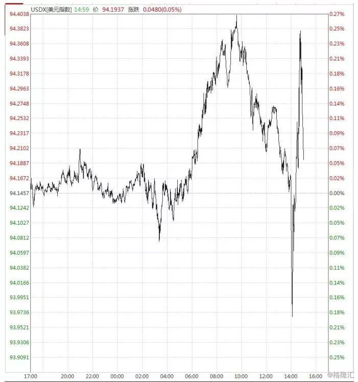 美元指数盘中一度大幅跳水,回吐此前涨幅。纽约尾盘收涨0.18%,报94.3139。美元在美联储加息后缩减涨幅。
