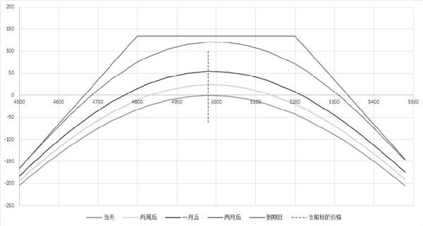 其二,我们还可以在卖出宽跨式组合的基础上额外买入1手行权价更高的虚值看涨期权来对冲价格上行的风险。这里我们选择买入SR901C5300合约,价格为34.5元/吨。买入虚值看涨期权后,整个组合变为卖出一手SR901P4900合约以及SR901C5200合约并买入一手SR901C5300合约,整个头寸可获得权利金收益1095元,需要额外支付保证金及权利金总计4320.4元。若后市价格变化不大,所有期权到期价值归零,可获得最大投资收益1095元,最高收益率约为25.3%。而如果到期时期货价格超过5300元/吨,该组合仍然有95元的收益。由于买入了1手看涨期权,所以该组合只有一个下盈亏平衡点4790.5元/吨。当到期日期货价格高于4790元/吨时,整个头寸会有盈利或至少打平。