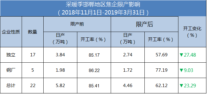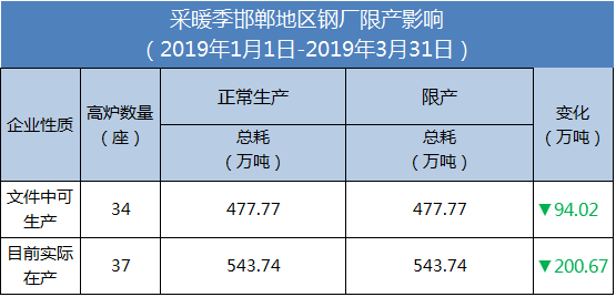 2019年1月1日-2019年3月31日,排除文件中高炉运行天数为0的,理论可生产高炉为34座,限产后日耗为4.26万吨;截止目前,据调研邯郸地区在产高炉为37座,当前日耗为5.51万吨,执行采暖季限产后日耗将减少1.25万吨。