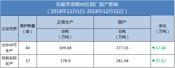 2018年11月1日-2018年12月31日,排除文件中高炉运行天数为0的,理论可生产高炉为40座,限产后日耗为5.08万吨;截止目前,据调研邯郸地区在产高炉为37座,当前日耗为5.51万吨,执行采暖季限产后日耗将减少0.43万吨。