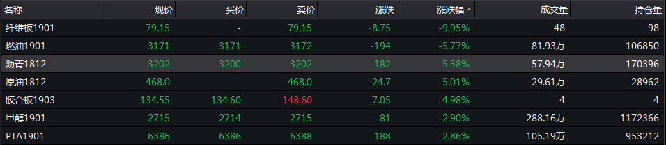 午后,燃油及沥青期货主力合约先后跌停。甲醇加速下跌,盘中跌超4.3%。PTA跌近3.2%。聚丙烯跌近2%。
