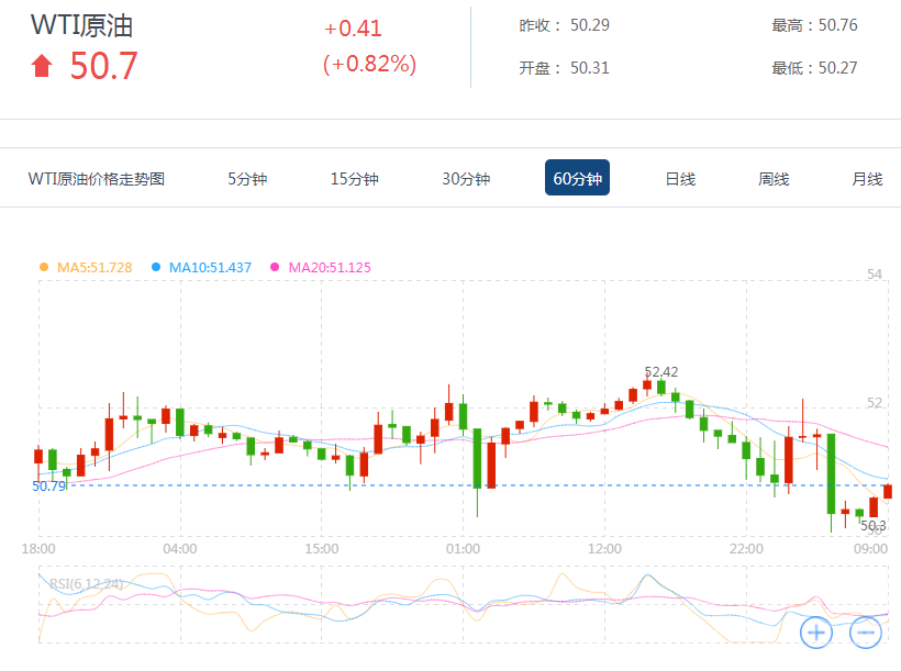 目前,WTI原油上涨0.82%,报50.7美元;布伦特原油下跌2.34%,报59.62美元。