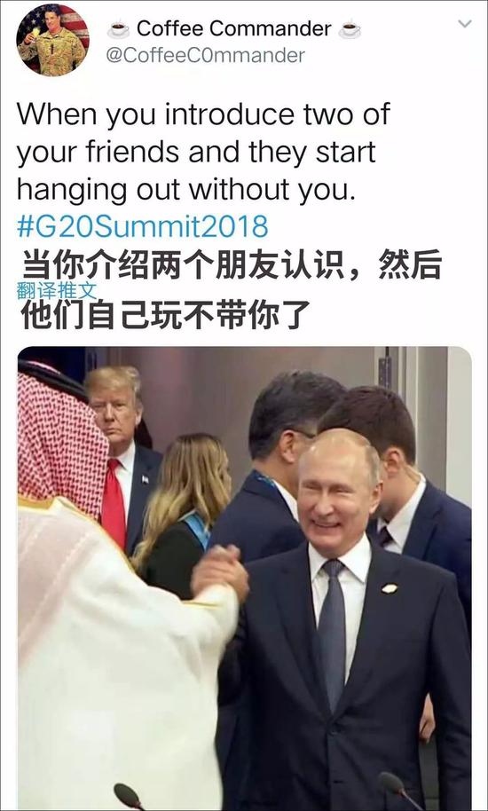 网友同时捕捉到,另一个细节——普京和沙特王储热烈互动时,在众人簇拥下走入房间的特朗普显得有一丝落寞。特朗普此前在沙特记者卡舒吉被害案上力挺王储。