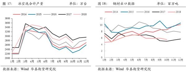 2018年10月民用钢质船舶产量为291.9万载重吨,同比增长35.6%;1-10月民用钢质船舶累计产量为2755.6万载重吨,同比下降7.9%。家电方面,10月空调产量为1356.8万台,同比下降0.4%。1-10月空调产量为17368.2万台,同比增长10.6%。10月我国家用洗衣机产量为662万台,同比增长4%;1-10月我国家用洗衣机产量累计5811.2万台,较去年同期增长0.4%。10月我国家用电冰箱产量为685.4万台,同比增长5.2%;1-10月我国家用电冰箱产量累计6687.7万台,较去年同期增长2.2%。船舶产量由于统计口径有所更改,2018年降幅不大,但对比17年数据则降幅在30%左右,预计2019年持平。家电方面国内消费疲软态势继续,出口还是有一定竞争力,预计产量降幅0~5%之间,减少钢材消费0~0.1%