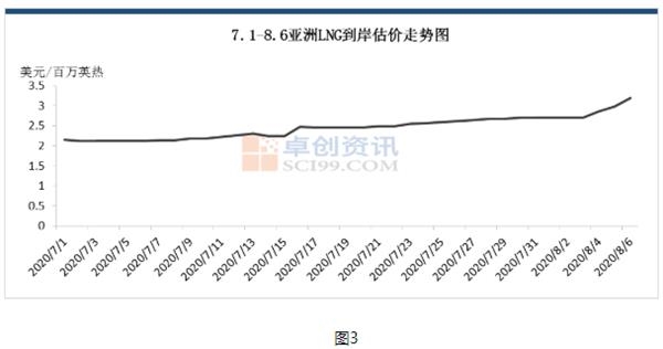 当然,疫情控制和改善的影响绝不仅限于美国,目前,许多国家不仅国内消费需求逐渐回暖,而且出口需求也即将增加,总体来看,全球天然气需求虽依然较为疲软,但已出现好转,因此英国NBP、荷兰TTF等天然气期货也随之有了明显的上涨。以欧洲为例,相关的气象模型显示,本周欧洲境内将逐渐迎来高温天气,出口需求也将增加,订单取消的数量有所减少。而与此同时,部分国家出口的增加将会在一定程度上提高市场的活跃度,从而对接下来的现货到岸价产生积极影响。在经历了较长一段时间的低迷之后,受荷兰TTF天然气期货上涨的影响,亚洲的现货到岸估价8月4日为2.858美元/百万英热,相比于前一日的2.7美元/百万英热上涨了0.158美元/百万英热,随后的5日和6日涨势愈发明显,6日更是达到了3.189美元/百万英热,这也是今年亚洲现货到岸价自3月26日以来首次破“3”。