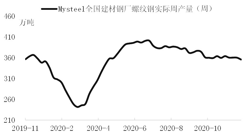 四季度以来,由于成本端铁矿石和焦炭表现强势,螺纹钢虽然价格上涨,但利润收缩较为明显。11月以来,铁矿石现货上涨超过30%,焦炭现货上涨超过7%,导致螺纹钢成本抬升超过400元/吨,而螺纹涨幅较为有限,北方螺纹钢仅上涨200元/吨。所以我们看到近期螺纹钢价格虽然上涨,但是利润在持续压缩。如果根据最新的美金矿和焦炭成本计算,北方螺纹钢高炉厂已逼近盈亏平衡线,且近期废钢价格也出现强势上涨,电炉钢利润从前期的高位回落至目前的微利水平。利润压缩在很大程度上抑制了钢厂的生产热情,叠加四季度原本为钢厂检修较多的时段,螺纹钢产量出现持续小幅下移。上周Mysteel统计的螺纹钢周产量为355.45万吨,环比下降4.44万吨,较7月份400万周产量高点下降超过10%。