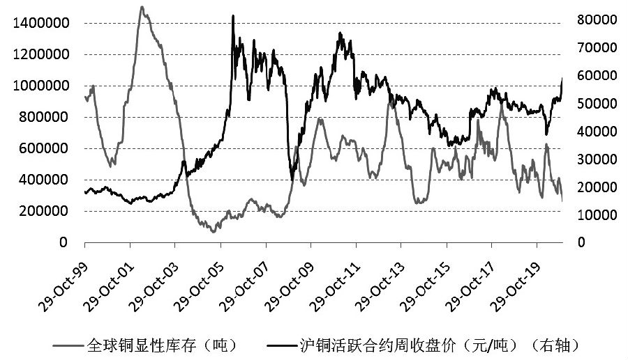 图为全球铜显性库存和沪铜周收盘价