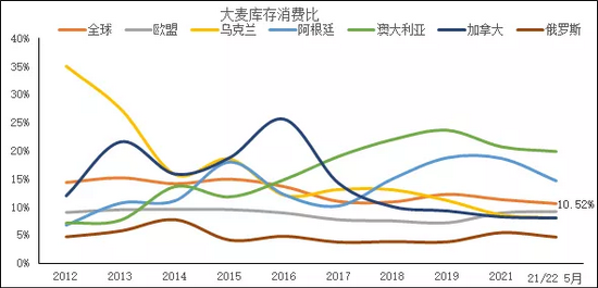 根据7月USDA报告,2021/22年度全球大麦库存消费比为10.52%,同比下降0.73个百分点,分项来看,2021/22年度欧盟、乌克兰、阿根廷、澳大利亚、加拿大、俄罗斯大麦库存消费比分别为:9.2%、8%、14.7%、19.9%、8.0%、4.6%,同样处于历年均值。我国目前进口大麦约为900万吨/年,主要是从加拿大、澳大利亚、乌克兰、法国等区域进口,考虑大麦与其他谷物种植收益比较,认为上述主销国提高大麦种植面积潜力有限。