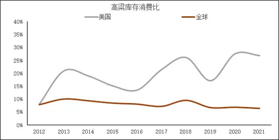 根据7月USDA报告,2021/22年度全球高粱库存消费比为6.52%,美国高粱库存消费比为26.88%,2020/21年度中国进口高粱约为650万吨/年,其中从美国进口高粱为550万吨/年,同样高粱由于种植收益低于其他谷物,继续提升高粱种植面积有限。