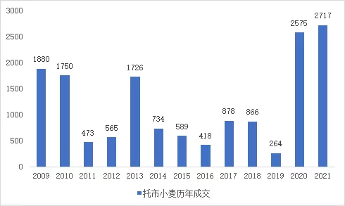 自去年10月以来托市小麦累计投放1.16亿吨,累计成交4168万吨,成交率36%,而2017-2019年托市小麦累计成交数量分别为878万吨、866万吨、264万吨,三年均值为669万吨。假设期间小麦产量和小麦面粉需求相对稳定且2017-2019年玉米/小麦价差,可合理推断托市小麦成交全部为面粉企业参拍,进而推算出2020/21年饲用小麦成交数量3499万吨。根据国家粮油信息中心公布的小麦产需平衡表,2021/22年小麦产需缺口为48.2万吨,其中小麦饲用消费约为3600万吨。据不完全统计,托市小麦库存预计为4900万吨,为近几年低点,其中2014-16年小麦约为1600万吨,我们认为未来1-2年托市小麦可投放量会减少,预计国产小麦价格涨幅会高于玉米或稻谷。