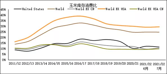 根据USDA公布的7月供需平衡表,可以看出2021/22年度全球玉米库存消费比24.84%,处于近5年低位,分项来看,美国、阿根廷、巴西、乌克兰2021/22年度玉米库存消费比分别为:11.6%、18.13%、12.23%、16.25%,皆处于近5年历史低值。就玉米出口量级需重点关注美国,根据7月USDA报告,2021/22年度美国玉米出口数量为6350万吨,环比(+127)万吨,同比(-889)万吨。截至当前中国从美国采购新作数量为1000万吨左右,后期不排除继续采购美玉米新作,同时叠加单产大概率下调,美玉米期末结转库存有进一步下调可能。