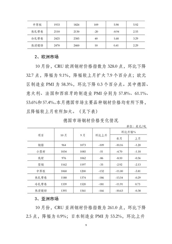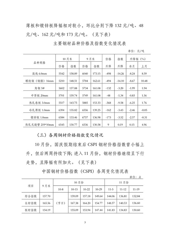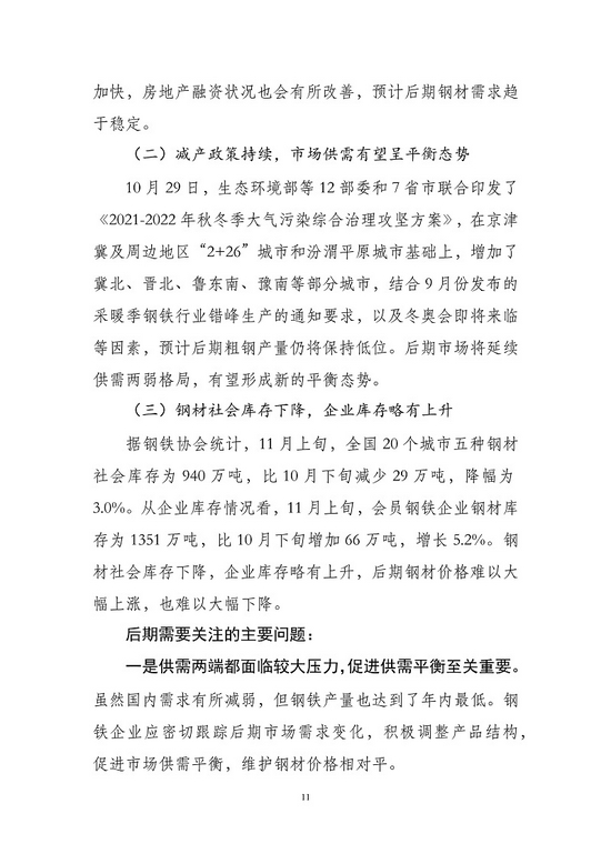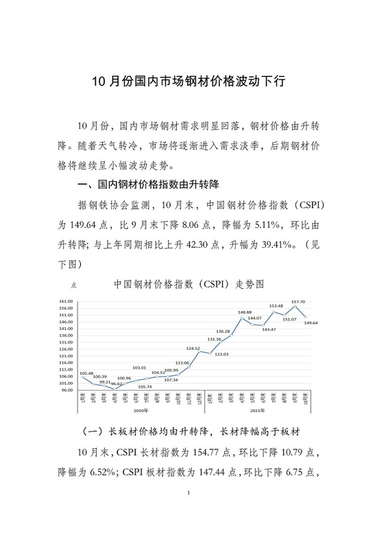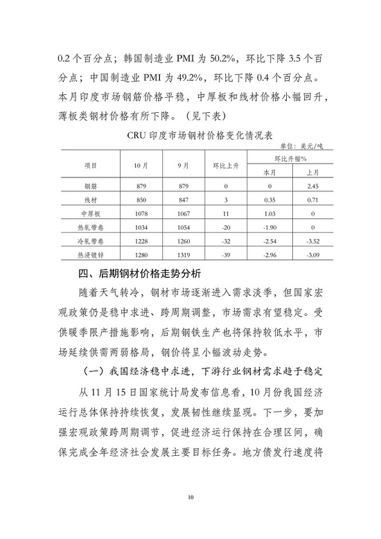 中钢协表示,10月份,国内市场钢材需求明显回落,钢材价格由升转降。随着天气转冷,市场将逐渐进入需求淡季,后期钢材价格将继续呈小幅波动走势。