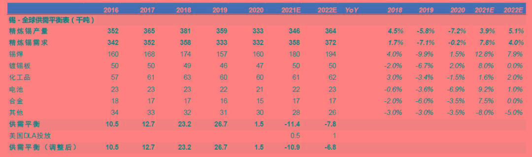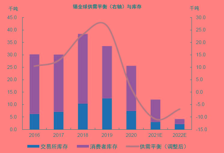 2020年受疫情影响,我们估算全球精炼锡产量同比下降7.2%,2021年锡产量同比上升3.9%至34.6万吨,但仍比2019年的供应少3.6%。今年的主要减量来自于印尼锡矿产量减少、马来西亚冶炼公司因疫情停止运营4个月以及少量来自玻利维亚运营干扰影响;增量主要来自中国和秘鲁的冶炼运营从2020年疫情影响中恢复以及秘鲁Minsur公司的B2尾矿项目。锡矿方面,位于刚果(金)的Bisie项目在2019年投产,当地锡矿出口量逐年上升,主要目的地为中国,部分弥补了缅甸矿供应下滑的问题。