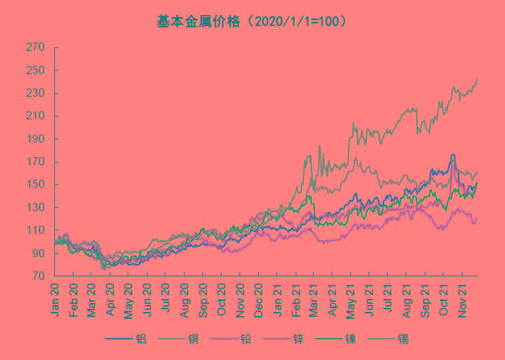 在此,我们重申《大宗商品2022年度展望:损有余,补不足,再均衡》中我们对基本金属的排序:随着疫情影响边际减弱,传统领域需求增速放缓趋势不改,能源转型(光伏、风电装机)和下游电气化(新能源车、5G应用)将带来主要需求增量,其对金属需求的贡献程度从大到小为:锡、镍、铜、铝、锌、铅;供应端,“碳中和”背景下,高耗能、高排放行业既面临政策直接约束,也面临“旧能源(碳)”成本变高的间接约束,考虑原材料供应瓶颈(锡)和冶炼产能投资放缓(铜、铝),我们对潜在供给瓶颈和干扰的程度大小的排序为:锡、铝、铜、镍、锌、铅。