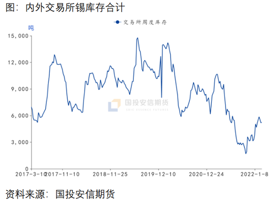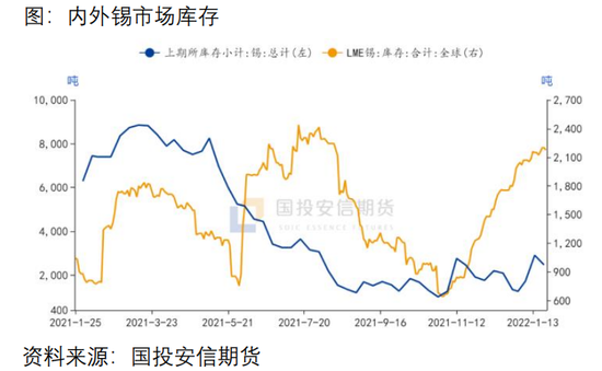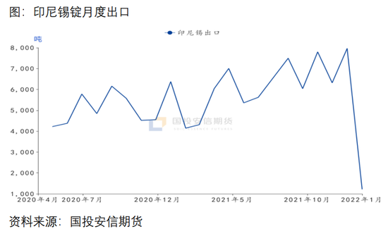 我们认为锡价上涨与地缘冲突关系不大。USGS 数据显示,2021 年俄罗斯锡锭产量 5000 吨,占比 0.92%;中国与印尼是全球两大主流锡供应国。8 日上午,SMM1#锡现货价格较前日下调4000 元报 34.75 万元/吨,基本平水交割月锡价。因此,印尼出口稳定性是伦锡上涨趋势的关键,市场也只能等待数据落地。