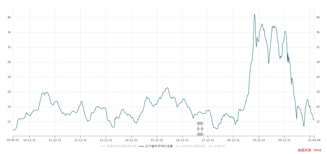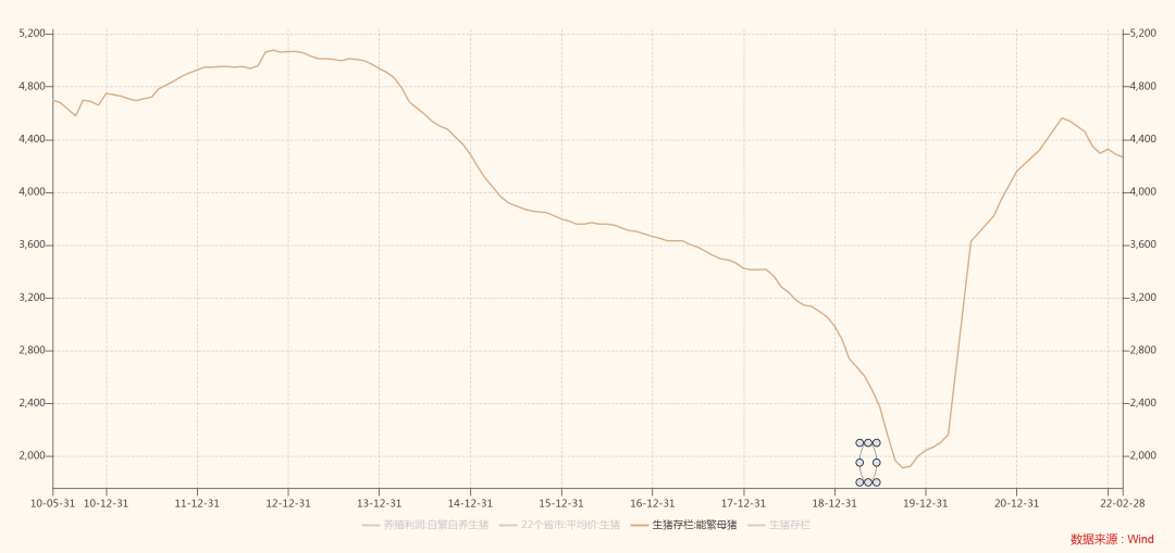 今年1-4月份的生猪供应是由2021年上半年的能繁母猪数量决定的,2021年上半年能繁母猪数量逐月增加至6月达到年内高点4564万头,这也就说明短期生猪短期供应相对宽裕。2021年下半年其中前五个月是逐月递减的,截至2021年11月底能繁母猪4296万头,12月底4329万头。母猪存栏数量整体处于由近年同期偏高位置。今年能繁母猪1月份小幅去化,存栏4290万头,环比减少1.6%,2月份能繁母猪4268.2万头。今年前两个月能繁母猪去化程度并不大,未来可继续关注产能去化情况。