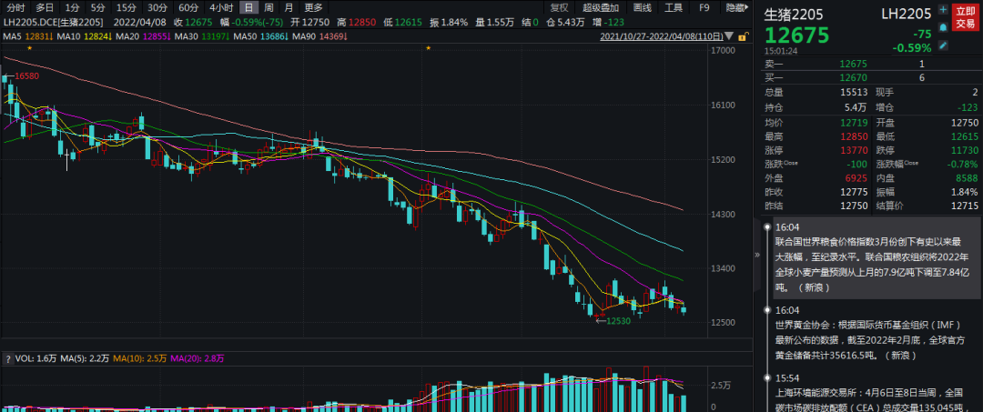 截至今天收盘,生猪2205基差-375,2205合约和2209合约价差-4690,不同月份合约价格保持近弱远强格局。期货库存仓单0张,本周无变化。