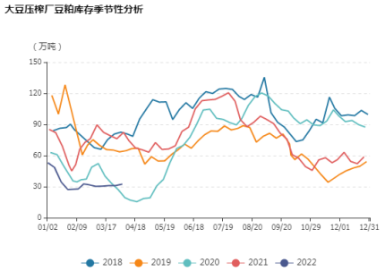 截止2022年4月3日,油厂豆粕库存为32.44万吨,环比增加1.43万吨。从季节性来看,豆粕存位于历史较低水平。