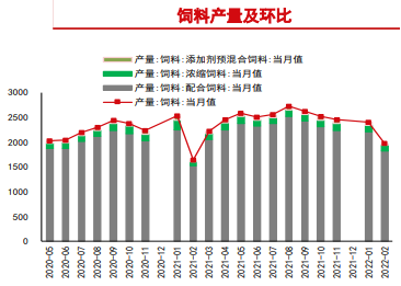 2022年2月,饲料当月产量1976万吨,环比-2.5%;同比+3.7%;累计产量4384万吨,累计同比+3.5%。2022年2月,猪饲料当月产量924万吨,环比+4.6%,同比+12.9%;累计产量2126万吨,累计同比+2.9%。