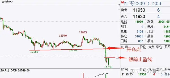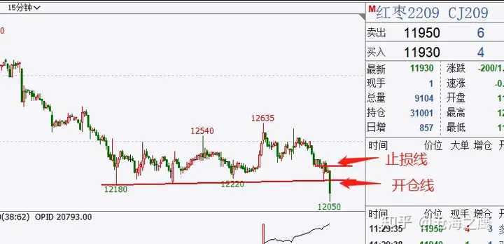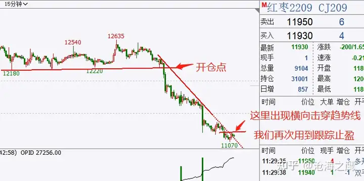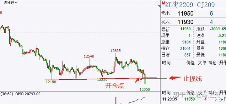 如图,打到12050附近,就可以下调你的止损线,调到开仓点,因为我们时刻假定市场会出现任何可能,比如突然的反拉。这样即可以防范风险,保护本金,又可以避免过早的止盈,失去后面的利润。如下图: