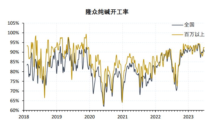 供给:本周纯碱产量60.34万吨,上周61.04万吨,环比-1.15%。其中重碱产量30.79万吨,上周31.65万吨,环比-2.72%;轻碱产量29.55万吨,上周29.39万吨,环比+0.54%。纯碱整体开工率90.30%,上周91.34%,环比-1.04%;12家百万吨企业整体开工率92.36%,上周92.41%,环比-0.05%。