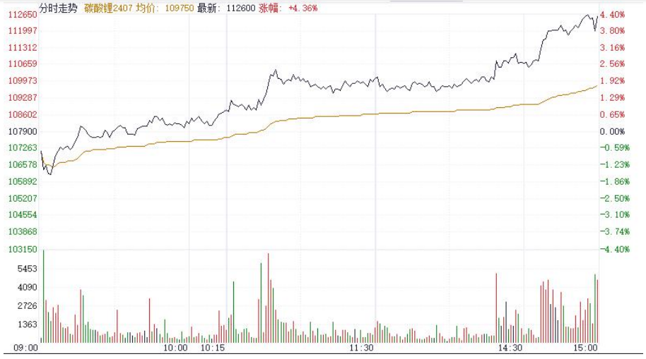 4月1日,LC2407开于107100,收于112600,较前一交易日收盘上涨5.18%。今日碳酸锂主力合约早盘低开,随后一路震荡上行,迎来一波涨势。