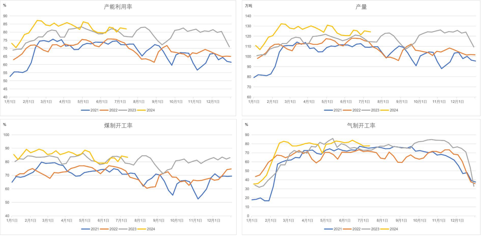 产量:2024年第28周(20240705-0711),中国尿素产量124.28万吨,较上周增加3.88万吨,环比跌0.76%;周均日产17.75万吨,较上周减少0.14万吨。