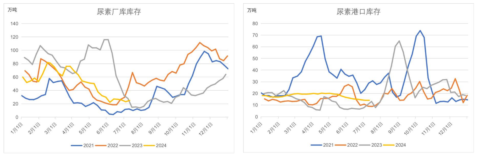 港口库存:本周期港口未见明显变化,整体港口库存量相对稳定。截至2024年7月11日(第28周),中国尿素港口样本库存量为14.1万吨,环比持平。