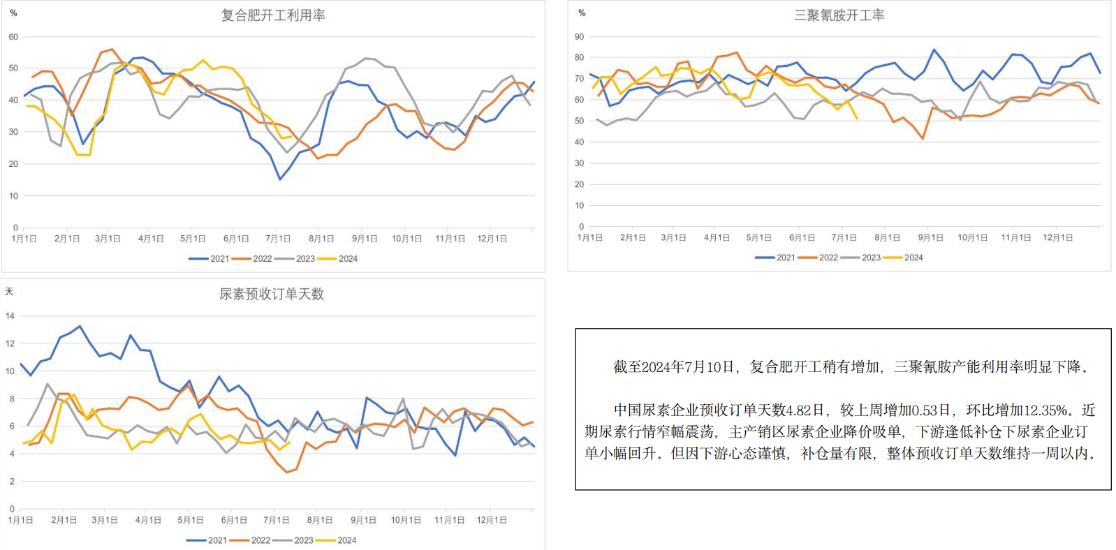 工业需求:复合肥开工稍有增加,三聚氰胺产能利用率明显下降。随着秋季肥陆续推进,下游复合肥秋季生产预期临近,加之原料库存低位,故而有适当跟进补货预期,但拿货整体情绪依旧谨慎。