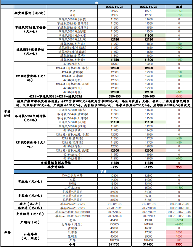26 日工业硅震荡走弱,主力 2501 收于 11870 元/吨,日内跌幅 3.3%,持仓增仓 32451 手至 21.8 万手。现货止涨企稳,百川参考价 11960 元/吨,较上一交易日持稳。其中#553 各地价格区间回升至 11300-12150 元/吨,#421 价格区间涨至 12150-12850 元/吨。最低交割品回归#553 价格至 11150 元/吨,现货贴水收至 775 元/吨。