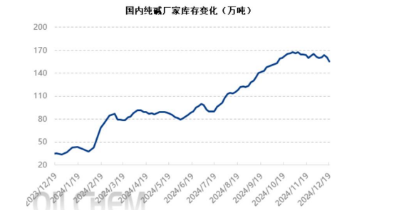 据隆众资讯,截止到 2024 年 12 月 19 日,本周国内纯碱厂家总库存155.74万吨,较周一减少 4.80 万吨,跌幅 2.99%。其中,轻质纯碱61.77万吨,环比减少 1.18 万吨,重质纯碱 93.97 万吨,环比减少3.62 万吨。