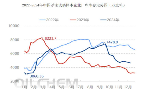 据隆众资讯,截止到 2024 年 12 月 19 日,全国浮法玻璃样本企业总库存4657.5 万重箱,环比-105 万重箱,环比-2.21%,同比+43.96%。折库存天数21.4 天,较上期-0.7 天。华北区域出货较好,产销率多在平衡以上,去库明显,尤其沙河企业库存低位,京津唐企业情况不一,整体库存亦下降。华东区域企业周内整体出货尚可,平均产销率在平衡以上,库存下降明显。华中市场本周产销率前低后高,整体库存延续下降趋势,但降幅较上期收窄。华南市场企业出货有所分化,整体库存略有增加。