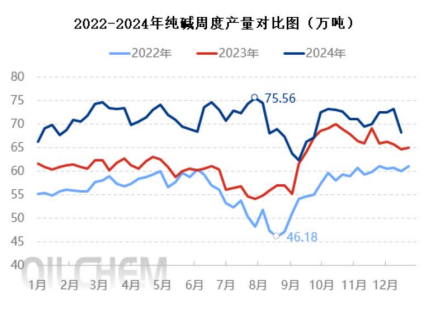据隆众资讯,截止到 2024 年 12 月 19 日,本周纯碱产量68.24万吨,环比减少 4.94 万吨,跌幅 6.76%。其中,轻质碱产量29.75 万吨,环比减少0.95万吨。重质碱产量 38.48 万吨,环比减少 3.99 万吨。个别企业检修,纯碱产量及开工下降。