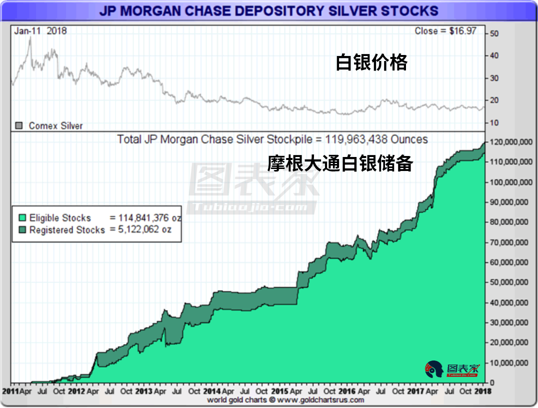 数据显示,摩根大通所持有的白银储备从2011年的0盎司增加到现在的1.2亿盎司。