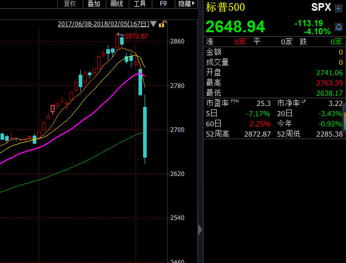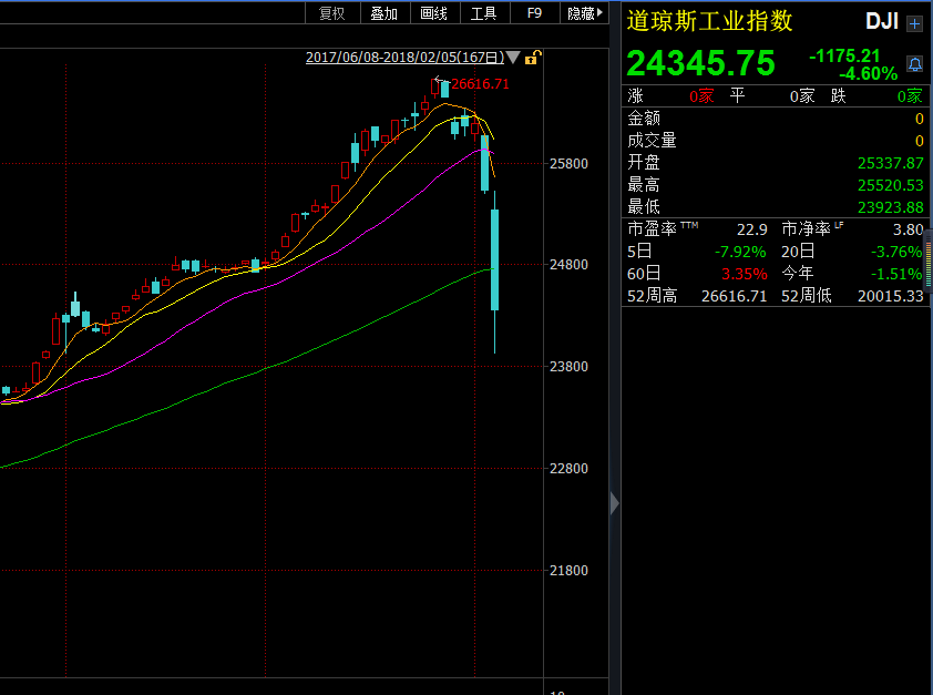 美股遭遇黑色星期一,周一美股连续两天大跌。道指重挫1175.21点或4.6%,报24345.75点;纳指收跌3.78%,报6967.53点;标普500指数收跌4.1%,报2648.94点。道指和标普500指数均创2011年8月以来最大单日百分比跌幅,并抹去今年以来涨幅。