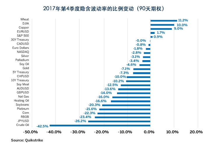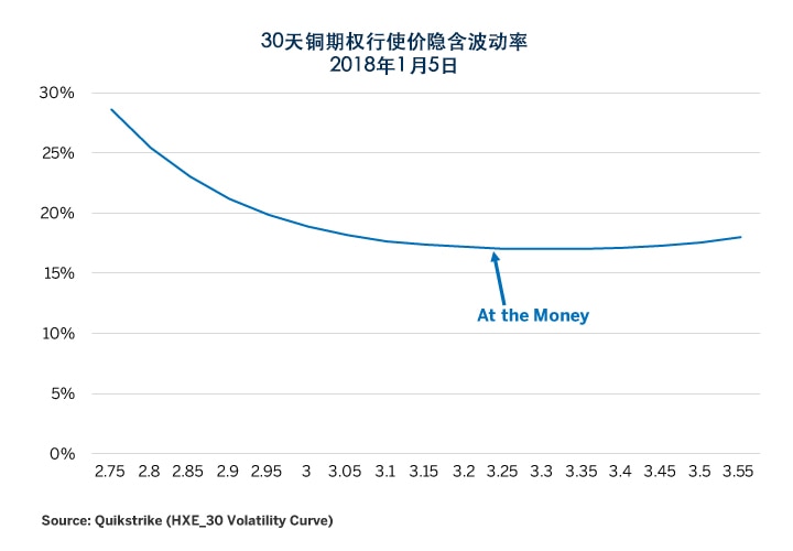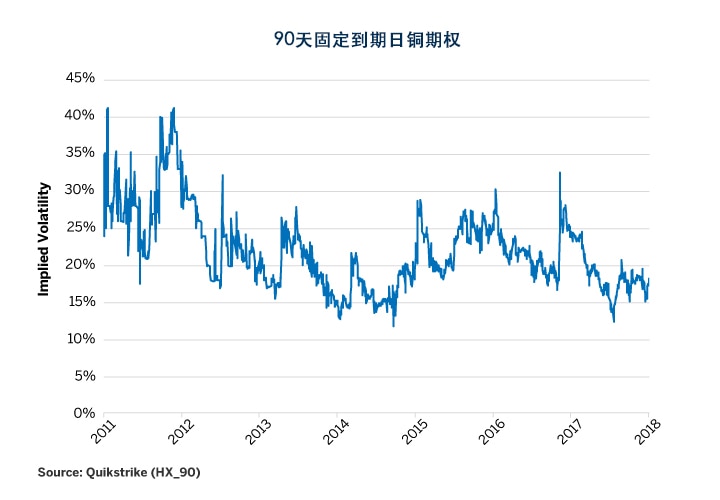但如果深入分析铜期权市场,可以看到从价内(ATM)期权开始呈现很高的下行偏度。价外(OTM)看跌铜期权的隐含波动率远高于类似的价外看涨期权(图3)。此外,在2017年第4季度,铜期权的隐含波动率较之第3季度有所上升,而大多数其它期货合约的期权隐含波动率均显著下降(图4)。