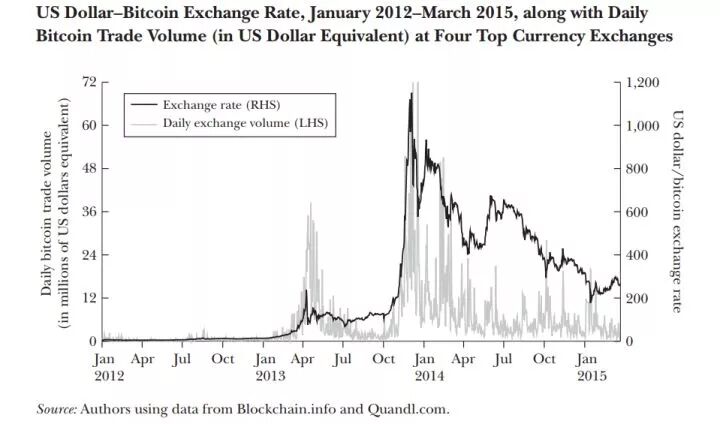 任何比特币的持有者都会面临比特币汇率波动带来的市场风险。下图中描绘的是几个主要比特币交易平台的美元/比特币汇率和每周交易量。无论是把比特币作为交易媒介还是价值储藏,2013年到2015年间价格的大幅波动都会明显影响比特币交易者的行为。