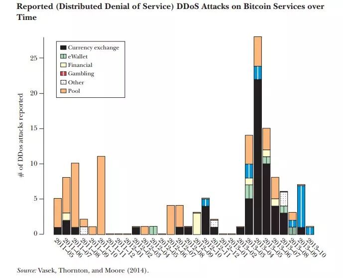 对那些通过各种中介使用比特币的人,拒绝服务攻击(denial-of-service attacks)会产生极大的操作风险。拒绝服务攻击目是通过大量的信息和请求使得目标公司服务器变得无法使用或非常缓慢。这种攻击有不同的动机。例如,对矿池(矿池即是合伙挖矿,然后再分配比特币收益)的攻击可以阻碍其挖矿过程,从而为所有其他矿工(Johnson,Laszka,Grossklags,Vasek and Moore 2014)带来优势。一旦传出被攻击的消息,就可能会破坏交易过程中的信任,甚至会损害比特币本身的信任 —— 从而使得攻击者以较低的价格购买比特币。最后,攻击者可以通过威胁攻击破坏服务运营和客户信心,向服务提供商(如交易所)索取赎金。下图绘出了用户在2011年至2013年流行的 bitcointalk.org 论坛上报告的拒绝服务攻击数量,显示出从集中攻击矿池到集中攻击交易所的变化过程。尽管整个网络都存在拒绝服务攻击,但攻击交易所相对更容易变现。