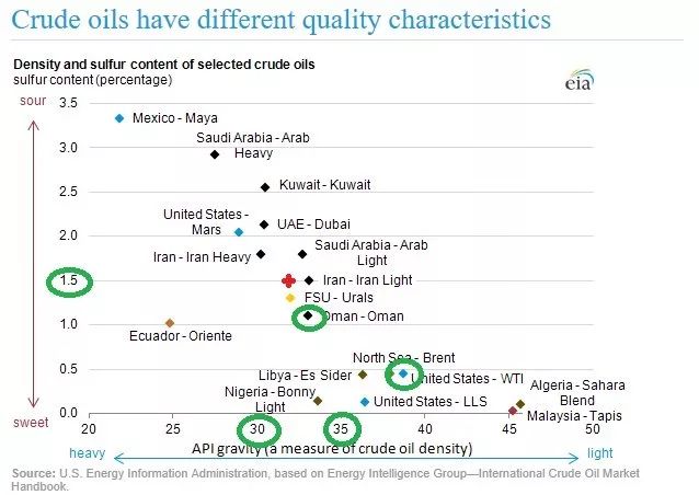 第一, 从上海原油期货要交接的原油含硫量和比重来讲,可以这样说:上海原油期货和迪拜商品交易所(DME)的阿曼原油期货(OQD) 基本是同一产品离岸价格和到岸价格的关系。(请看下面的一张图, 图中的红点代表上海原油期货的在整个世界原油现货中的含硫量和比重关系图中的位置)。