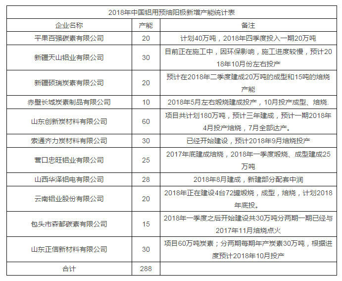 2017年电解铝行业产能迅速投放,短时间内对阳极需求提高造成市场供不应求,另外环保压力及供给侧限产造成阳极供应减少,促使2017年阳极价格阶段性冲高。据百川数据统计,2017年建好的331万吨,只有86万吨投入生产,其中的245万吨,将在2018年释放产能。2018年,铝用阳极的在建产能达到288万吨/年。预计2018年预焙阳极的产量2050万吨左右,减去出口100万吨,国内供应1950万吨。2018年二季度之后,新建产能的投产,加上供暖季结束,原有产能复产,预焙阳极供应量加大,价格仍有下行空间。