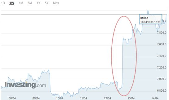 4月14日北京时间9点,美国总统特朗普称,美国已联合英国和法国对叙利亚军事设施实施精准打击。空袭发生后,全球市场被激起连锁反应,比特币、黄金、原油等避险资产价格纷纷飚升。有分析认为,随着避险情绪升温,下周首先要留意周末叙利亚被空袭的影响发酵情况,可能会对黄金、股市、原油都会产生较大的影响。
