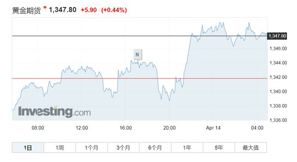 纽约商品交易所6月交割的黄金期货周五价格上涨5.9美元,涨幅为0.44%,收于1347.80美元/盎司。本周金价累计上涨大约0.8%。