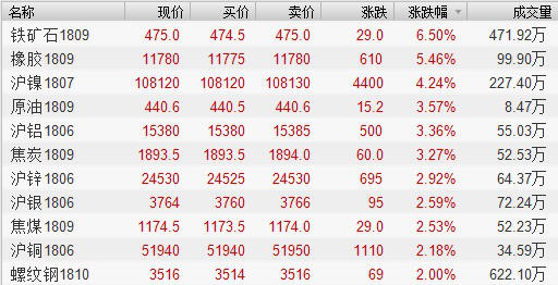 国内期市收盘工业品强势大涨,铁矿石大涨逾6%,橡胶涨超5%,沪镍涨超4%,原油、沪铝、焦炭涨超3%,国内经济向好叠加俄铝制裁事件影响,提振工业品涨势。